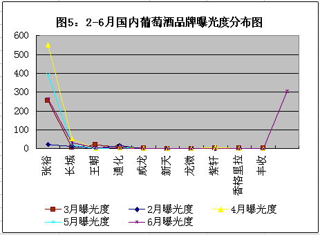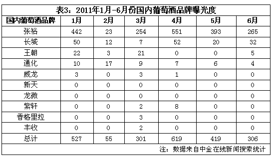 2011年1月-2011年6月份国内葡萄酒品牌曝光度数据见表3。