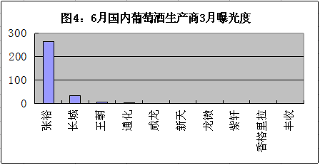 从表3可以看出,5月6月国内葡萄酒各品牌曝光度已经连续两个月明显下滑,6月行业总曝光度较5月下降了27%。除了排名前四的张裕、长城、王朝和通化外,其余品牌的新闻报道几乎搜寻不到。