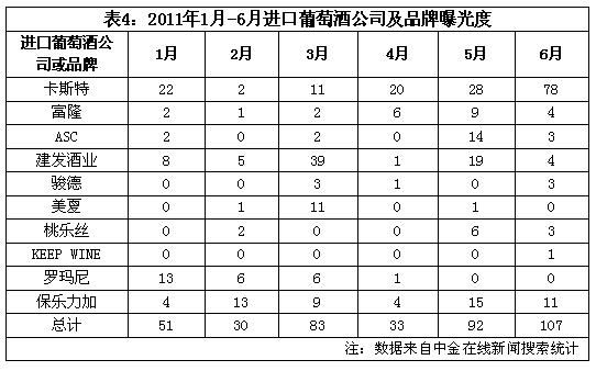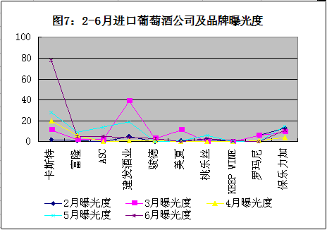 6月进口葡萄酒就品牌曝光度略有上升,其中要以卡斯特曝光度上升最多。卡斯特继续维持第一的位置,为祝贺中国共产党建党90周年,CASTEL酒庄将在7月举办90红酒品鉴、馈赠活动。卡斯特商标侵权案继续受到关注,法国卡斯特积极维权,倡导大众认清真伪。