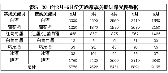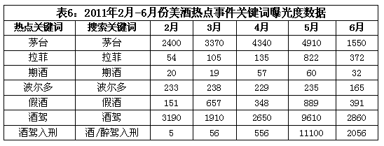 2011年2月-2011年6月美酒热点事件关键词曝光度的搜索数据见表6。