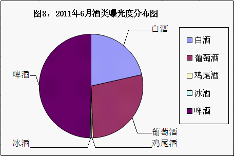图8可以看出,6月酒类曝光度排名依次是啤酒、葡萄酒、白酒、鸡尾酒、冰酒。啤酒进入销售旺季,各种啤酒展会、啤酒节纷纷到来,啤酒厂商也利用这个好时机,加大宣传力度,提高产品知名度。相信伴随着各种赛事的到来,啤酒销售会再创新高。