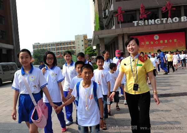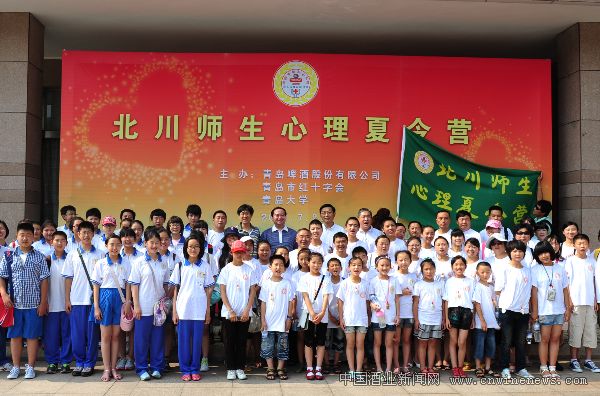 7月21日下午3点,青岛啤酒股份有限公司、青岛市红十字会、青岛大学、青大附中以及来自社会各界的领导、职工代表和志愿者们齐聚青岛啤酒厂,热情欢迎来自汶川地震灾区北川羌族自治县青岛啤酒曲山镇小学、陈家坝小学、陈家坝中学的42名师生来青岛参加“北川师生心理夏令营”活动。青岛市红十字会副会长丁刚首先代表市民向大家致欢迎词,随后青岛啤酒集团公司副总裁刘英弟向夏令营领队老师授旗,青岛大学副校长王焕良一声令下,为期一周的青岛北川师生心理夏令营活动正式拉开了帷幕。这是汶川地震发生后来自青岛市对口支援的第三批北川师生奔赴青岛参与活动,三年来北川师生心理夏令营活动累计参与的师生人数达到了100余名。