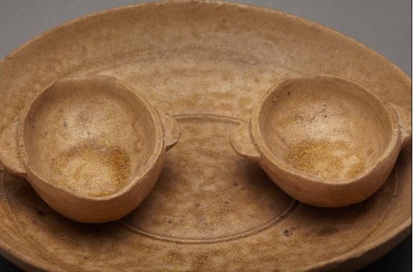 因此,可以这样认为,耳杯的历史使命的完成,大约在唐朝。也就是它做为饮酒器,与大唐盛世的饮酒习惯有点不合时宜后立马退出。这种轨迹,也可以从瓯江边上瓯窑生产的瓷器上窥测一斑。瓯窑最早出现于东汉晚期,那时几乎不见耳杯,但是到了西晋,就开始出现。从墓葬的冥器,陪有耳杯。但南朝以后,耳杯突然绝迹。纵观瓯窑,至今出土的耳杯也是寥寥无几,而其中可圈可点的是一件1972年温州市郊西廓洪庵山出土的西晋青瓷耳杯盘,其特殊之处,在于一敞口盘内底两侧平行贴耳杯两只,青黄色釉。这种两杯粘连一起的,从实用上来看,似乎是不便于饮酒,因此,是一种陪葬的明器一盘置两杯的风俗,或许有好事成双寓义,还原的是西晋时期燕乐的场景。但瓯人里一般无此种耳杯,它肯定出自北方或长江流域移民之手。考虑到西晋时大批北人南迁,耳杯会随行,故瓯窑的产品与时俱进便应运而生,同时又大胆紧跟时代的步伐,过时的就被无情出局。