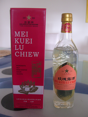 Meiguilu jiu ( lit. "rose essence liquor"): a variety of gaoliang jiu distilled with a special species of rose and crystal sugar. Alcohol content by volume: 54–55%.