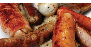 Single orders of sausages come with either sauerkraut (fermented cabbage), mashed potato or fries.