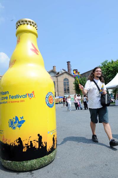 A man walks pass a big bottle model at the festival garden in Istanbul, Turkey, on July 2, 2011. The two-day open-air Efes Pilsen One Love Festival started on Saturday in Istanbul. (Xinhua/Ma yan)