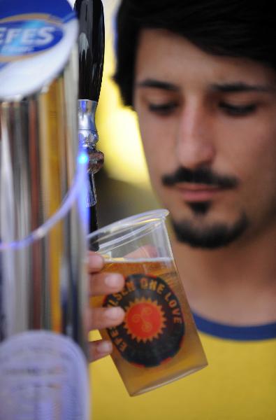 An attendant serves beer for festival goers at the festival garden in Istanbul, Turkey, on July 2, 2011. The two-day open-air Efes Pilsen One Love Festival started on Saturday in Istanbul. (Xinhua/Ma yan)