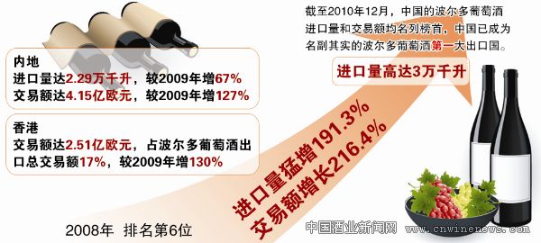 根据波尔多葡萄酒行业协会(CIVB)的数据,截至2010年12月,中国的波尔多葡萄酒进口量和交易额均名列榜首,中国已成为名副其实的波尔多葡萄酒第一大出口国。2010年,中国对波尔多葡萄酒进口量高达3万千升,首次超过德国居榜首。仅内地葡萄酒进口量就达2.29万千升,比2009年增长67%。与此同时,2010年全年交易额较2009年猛增127%,共成交4.15亿欧元,是交易额第二大国英国的近两倍。而香港的2010年交易额高达2.51亿欧元,占波尔多葡萄酒出口总交易额17%,比2009年上涨130%。与2008年相比,中国对波尔多葡萄酒进口量猛增191.3%,交易额增长216.4%,排名从第6位增长至第1位。