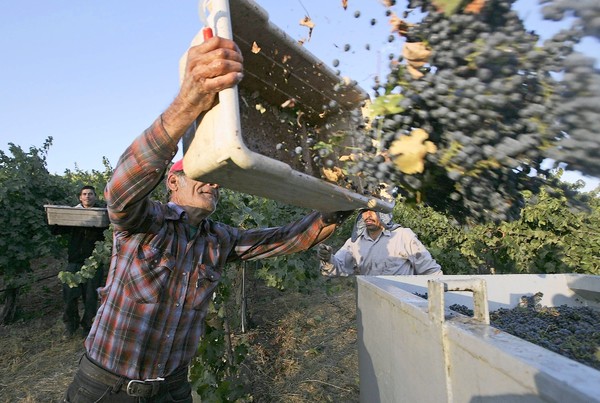 Cabernet grapes are gathered at a vineyard in the Napa Valley. According to a Stanford study, global warming will make the Napa region less hospitable to high-value wine grapes in the coming decades. (Justin Sullivan / Getty Images / October 18, 2005)