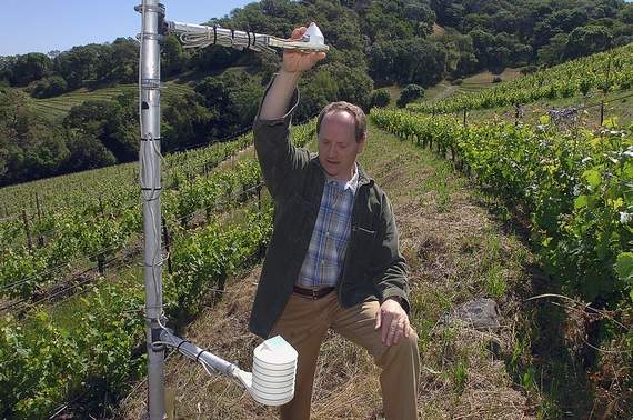 Christopher Howell, Cain Vineyard and Winery general manager, looks at one of the weather stations in the vineyard in St. Helena, Calif. Cain and other wineries in the Napa Valley are taking a leadership role in monitoring changing weather patterns by installing monitoring stations to better collect data.