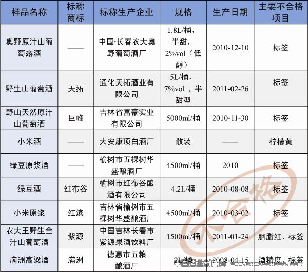 在不合格产品中,主要集中在标签、菌落总数、酒精度、胭脂红、糖精钠等项目上。