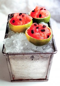 Lime cups filled with watermelon granita and dried currants look like miniature versions of half melons.