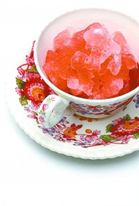 2. Pour tea mixture into ice cream maker and freeze according to manufacturer’s instructions. Alternately, pour tea into a shallow dish, put in freezer and allow to freeze around edges, 1-2 hours. Remove dish from freezer and scrape ice with fork from outside edges to center. Repeat this process every half an hour at least 3 times until mixture has turned into small, sequinlike ice flakes.