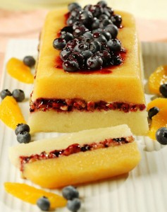 2. Fold berries into remaining preserves. Invert cake on plate. Spoon 1/4 of berry mixture on cake. Top slices with remaining berry mixture.