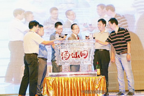 酒仙网董事长郝鸿峰与酒企代表共同向象征一言九鼎的冰雕大鼎中注酒。