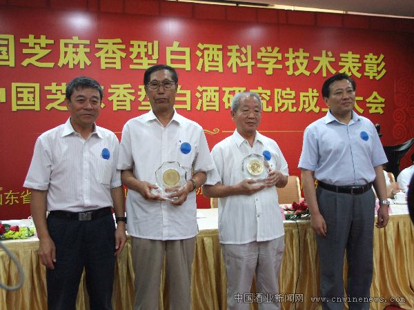 8月11日,由中国酿酒工业协会主办,山东省轻工业协会、山东省白酒工业协会、山东景芝酒业股份有限公司协办的“中国芝麻香型白酒科学技术表彰暨中国芝麻香型白酒研究院成立大会”在济南举行。会议对芝麻香型白酒科技进步做出突出贡献的周恒刚(已故)、于树民(已故)、沈怡方、高月明、王海平5文章来源华夏酒报位专家进行了表彰和奖励;同时,举行了高端芝麻香白酒研发中心——“中国芝麻香型白酒研究院”的揭牌仪式。图为中国酿酒工业协会理事长王延才(左一)、山东省轻工业协会会长李伟鸣(右一)为获奖专家高月明(左二)王海平(右二)颁奖。