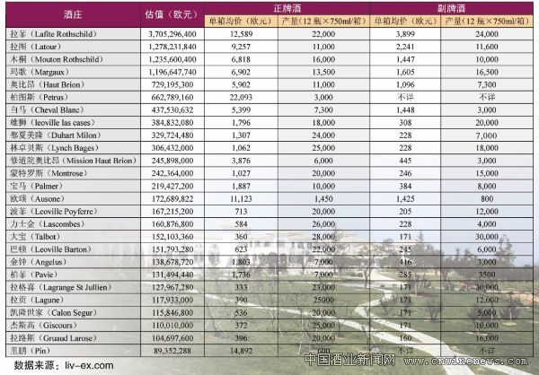 位居榜首的拉菲庄估值为37亿欧元,这一估值的计算依据为其正牌酒和副牌酒的均价。其正牌酒年产量约为22,000箱,均价为12,589欧元/箱;副牌酒产量为24,000多箱,均价为4,000欧元/箱。拉菲庄价格为排名第二的拉图堡(12.78亿欧元)的两倍还多,拉菲庄价格超过排名第六的柏图斯(Pét文章来源华夏酒报rus)的5倍,后者为右岸估值最高的酒庄,价值近6.63亿欧元。此外,里鹏庄(Le Pin)尽管产量非常低,仍位列第33名。目前,里鹏庄年产量仅有9000万箱。
