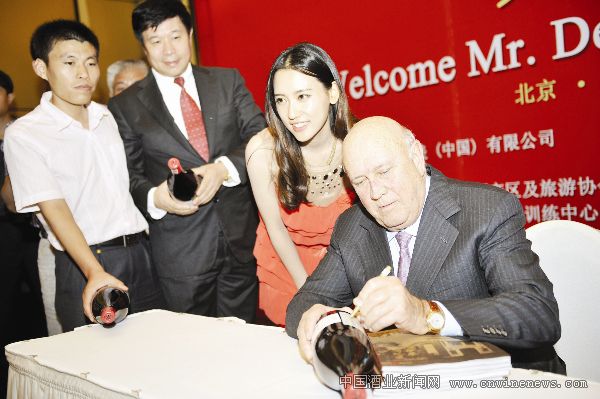 8月17日文章来源华夏酒报,在北京举行的“德克勒克中国行完美之夜”活动上,南非前总统德克勒克带来由他本人签名的“德克勒克”限量版南非精品葡萄酒,并表示愿致力于两国民间友好,促进商贸和旅游的发展。图为德克勒克在活动现场为消费者在“德克勒克限量版葡萄酒”酒瓶上签名。