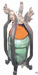 每个木结构都备有活门,便于开启,正中放置一只瓷罐,釉面光洁,古朴典雅,很像出自彭州桂花窑的瓷器。其中一个瓷罐外侧书有“酒”字,因而推测此青釉瓷罐为当时的盛酒器。木架上还放有铁环附系棕绳,王全判断应该是由两人用扁担抬着走,状如抬轿之态。思及如此,王全便与友人戏言,称该木架为“酒轿”。