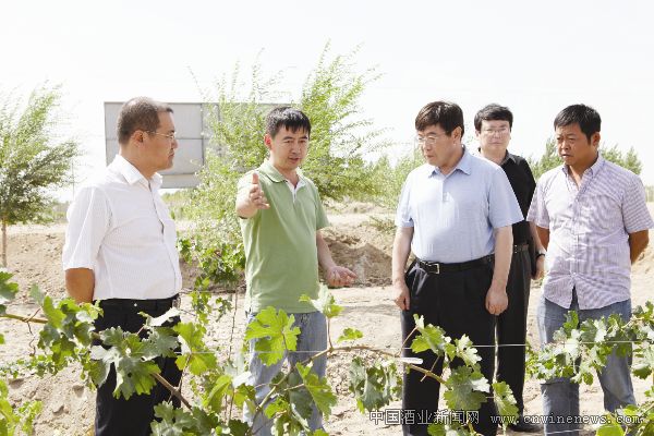 中共烟台市委常委、副市长,中国酿酒工业协会葡萄酒分会名誉理事长刘树琪(前排右二)在葡萄酒专家李德美(左二)的陪同下,在新疆焉耆县酿酒葡萄种植基地考察。