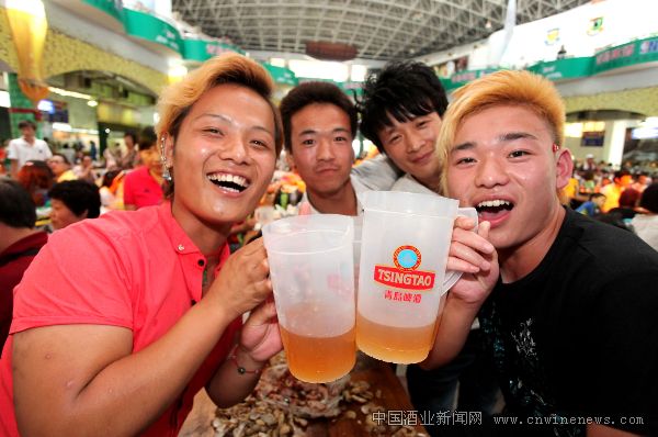 据统计,今年啤酒节开节至今,近300万游客豪饮啤酒600余万吨,而青岛独占半壁江山。每天,下班时间一到,青啤宫内觥筹交错,歌舞不断,十分热闹。不同肤色不是问题,语言不通也不要紧,只要手擎大杯青啤,那就是四海兄弟。