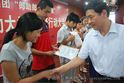 8月23日,四川古蔺郎酒销售有限公司城市经理水杰代表郎酒集团将20.4万元的助学金交给安徽省蚌埠市慈善协会,并通过蚌埠市民政局和蚌埠市慈善协会资助了68名学子。