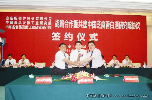 文章来源华夏酒报食品发酵工业研究院、山东省食品发酵工业研究设计院在北京钓鱼台国宾馆举行战略合作签约仪式,同时为中国芝麻香白酒研究院揭牌。图为山东扳倒井股份有限公司董事长赵纪文(中)、中国食品发酵工业研究院院长蔡木易(右)、山东省食品发酵工业研究设计院院长刘建军(左)在共建中国芝麻香白酒研究院协议上签约。