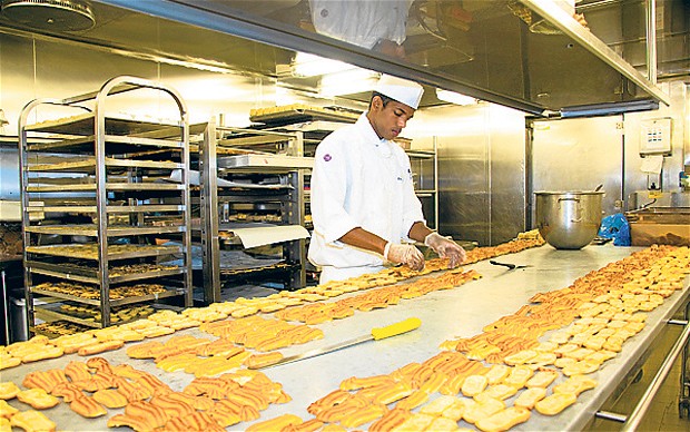 Twelve thousand meals are produced every day, not including special treats like the “chocoholics tea”; 128 day chefs cook the food for the crew canteens, the eight passenger restaurants, the burger bar and the pizza café. Thirty-six additional chefs spend the night doing prep work for the next day’s service, peeling potatoes, chopping veg and making 220lb (100kg) of coleslaw every single night. Teams of Filipinos bone out pork legs in the butchery, while others fillet tea-tray sized halibut in the fishmongery.