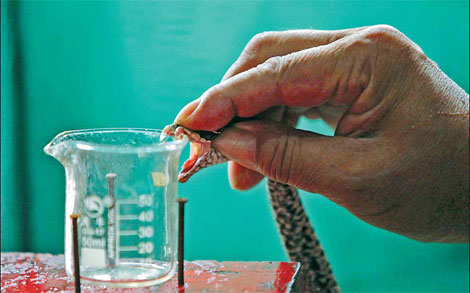 Yang Hongchang extracts venom from a snake, one of many valuable products the creatures provide. [Photos by Aly Song / Reuters]