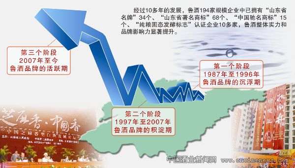 第三个阶段是2007年至今,这是鲁酒品牌的活跃期。在经历了第一阶段的浮沉和第二阶段的积淀以后,鲁酒主流企业开始转变观念、转变思路、转变做法,由以前的注重产品、注重质量、注重市场和注重营销,转为注重品牌和品牌文化,千方百计塑造自己的品牌,提升品牌形象,挖掘和弘扬品牌文化。一时间,齐鲁大地以品牌和品牌文化为重点的各式各样的“活动”“论坛”“探讨”等不拘一格,纷纷展开,鲁酒行业的交流、合作空前活跃,涌现出一大批影响力大、美誉度高的主流品牌。例如古贝春、扳倒井、兰陵、景芝、泰山、孔府家、花冠、琅琊台、趵突泉、景阳冈等。加之政府开始重视酒类行业的发展,并出台相关政策,组织各种会议,以实际行动支持鲁酒的发展,在行业内外叫响“走出山东,重铸辉煌”的口号。鲁酒企业也积极响应,纷纷采取措施,加大力度,为鲁酒的整体提升和发展创造了良好的环境。