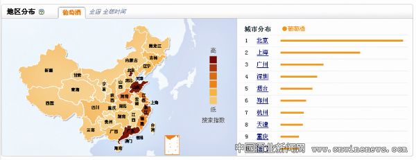 在国产葡萄酒品牌中,以张裕、长城、王朝三家葡萄酒生产商最为有名,位居全国葡萄酒产销量的前三甲。针对这三家企业,笔者利用互联网提供的一个比较便捷的信息来源——“百度指数”,来了解国内葡萄酒市场的分布情况及三大品牌的热点趋势情况。这个指数反映了一段时间内网民每天在百度上搜索某个关键词的次数,并显示某个关键词搜索量的变化趋势。通过网民对葡萄酒某个关键词搜索量的变化趋势,来反应其对葡萄酒的关注度,而网民的搜索内容是反映消费者现在和将来消费需求的一个很好的指标。这些用户关注度的信息,从另一个角度帮助我们了解整个行业、各个品牌的知名度及消费需求的相关信息。