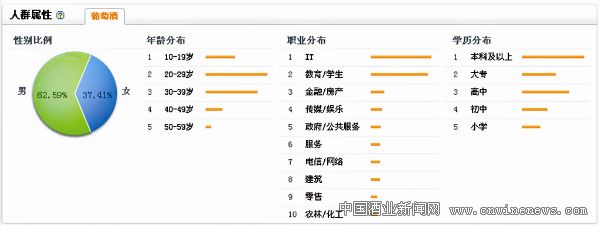 根据图3可以看出,后三项年龄分布、职业分布、学历分布对于葡萄酒企业参考价值有限,其反映的是中国网民的分布情况。但是第一项,性别分布却显示出女性消费者的潜力不容低估。退一步说,在中国网民关注葡萄酒的人群中,女性占了接近四成。我们可以观察到在超市购买葡萄酒的消费者中,女性很常见,而在饭店用餐时男士如果饮用白酒,通常也会建议女士饮用度数低一些的葡萄酒。同时,这个比例与欧美等葡萄酒消费成熟的国家基本吻合。