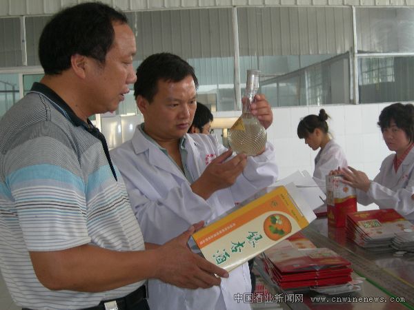 的银杏营养酒一炮打响,成为当地消费者的新宠。图为该公司董事长赵宗伟同技术人员一起在车间检查产品质量。