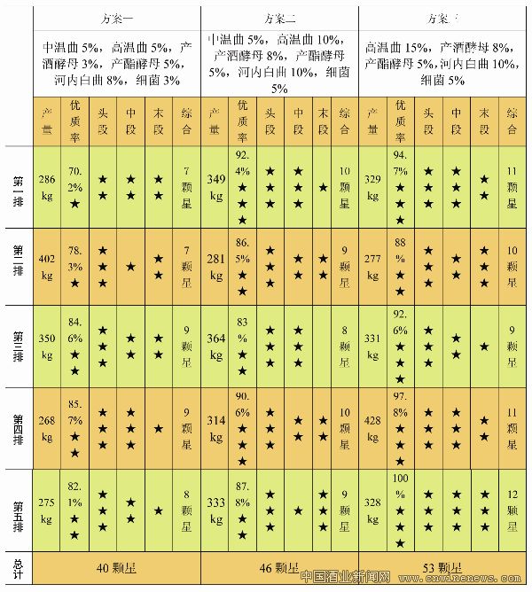 增加高温曲的用量,可提高发酵用曲中细菌的数量,从而为美拉德反应的形成创造条件,有利于增加酒体中高温曲香和酱香,提高基酒中高分子化合物的含量和酒体的丰满度。通过生产实践证明:方案三为较佳配方。