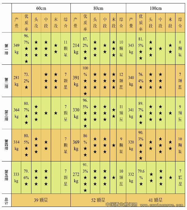 堆积高度与堆积温度有直接关系,堆积高度低时,虽然能够充分网络空气中的微生物,但延长了堆积时间,可导致升温缓慢,长时间堆积,会造成糟醅表面水份散失过大,而且会增加杂菌感染的机率。同时,还会造成糟醅内酒糟的损失。因此,堆积高度对质量有较大的影响。以上实验可知:堆积高度在80cm,出酒率及酒质较好。