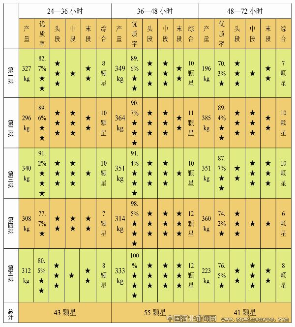 发酵期对原酒的质量影响较大,发酵期短(30天、40天),出酒率较高,但酒体醇厚度不足,酒体较寡淡;发酵期过长,酒体丰满度提高,但出酒率降低,从而导致成本增加。考虑到以上两种因素,采用45天发酵期较为合理。在发酵期较长的情况下,产量及出酒率45天较好,且酒体质量风格明显。