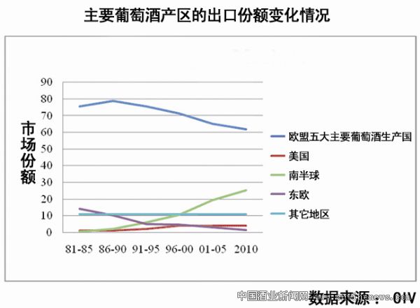 从图 1中可看出,欧盟主要葡萄酒生产国在全球葡萄酒出口市场所占份额正在不断下跌;南半球的低价优质葡萄酒越来越受到国际市场的欢迎;东欧国家的市场份额在不断下滑,并且这一趋势有望持续。为了阻止市场份额继续下滑,欧盟主要葡萄酒生产国将不得不继续降价。