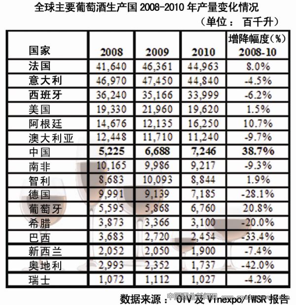 根据国际葡萄与葡萄酒组织(OIV)的统计数据,从2008年到2010年,全球葡萄酒产量下降了3%。这一数字未将中国计算在内。