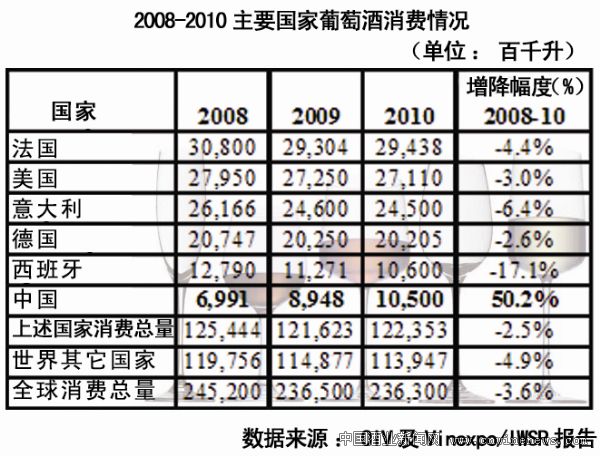 表2为主要国家的葡萄酒消费情况。OIV估计,2008年至2010年,全球葡萄酒消费下跌了3.6%,这与经济衰退直接相关。在全球前六大葡萄酒消费国中,跌幅最大的是西班牙,下跌17.文章来源华夏酒报1%。而中国的葡萄酒消费却逆市上升,增幅达50%。