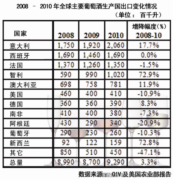 表4为2008—2010年全球主要葡萄酒生产国的出口情况。总体来看,自2008年以来,全球葡萄酒出口量下降了3.3%。而智利和新西兰的出口量增长最为显著,远超出其它国家。