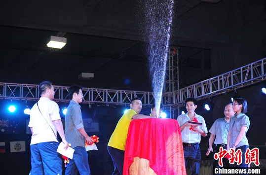 9月24日晚,佛山首届创意啤酒节以德国慕尼黑啤酒节最传统“破桶”启动开幕仪式,啤酒破桶而出激起数米高“啤酒花”。中新社发 柯小军 摄