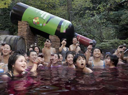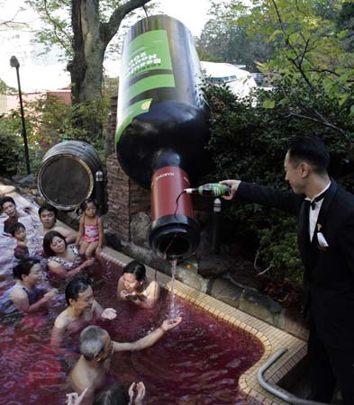 2007年11月15日,日本箱根一座露天温泉浴池内,为了庆祝薄酒莱酒新酿("Beaujolais Nouveaubath")上市,人们得以沐浴在添加了货真价实葡萄酒的温泉中。