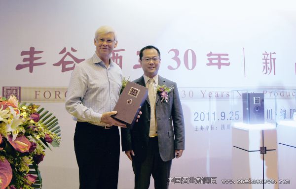丰谷酒业总经理马斌向恩格尔赠送刚上市的丰谷酒王新品30年。