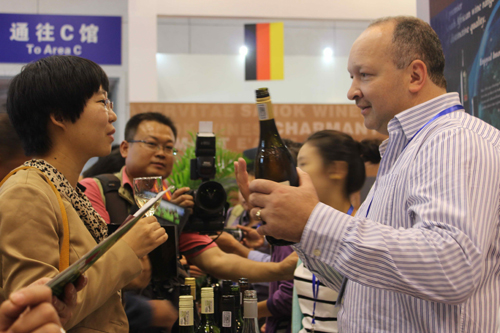 Wine exhibitors talk with potential buyers at the exhibit. Photo by Zhao Ruixue