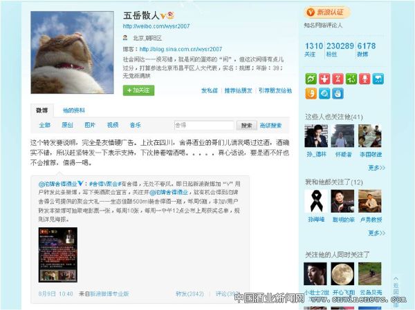 同时,意见领袖、知名人士也对活动给予了很好的响应。拥有粉丝量近30万的网络知名评论人“五岳散人”姚博在对活动的转发中说:“这个转发要说明,完全是友情硬广告。上次在四川,舍得酒的哥们儿请我喝过这酒,酒确实不错,所以赶紧转发一下表示支持,下次接着蹭酒喝……真心话说,要是酒不好也不会推荐,值得一喝。”