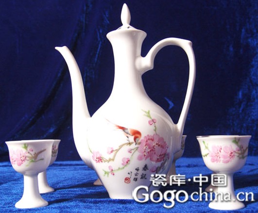 这套酒具由一只酒壶和六只酒杯组成,壶身和杯身都手绘着桃花,壶身背面题有“风来花自笑,枝上鸟鸣和”得诗句,起到好处的把这酒杯的意境淋漓的描绘了出来,体现出该套酒具的高贵,是赠送朋友、客户、领导的最佳礼品。