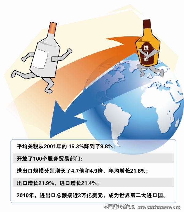 入世前夜,中国酒业对未来前景充满了疑问和猜想:洋酒产品涌入中国市场,传统白酒阵地失守?葡萄酒占领新生代消费群,白酒沦为夕阳产业?国外酒企实力强大、管理先进,中国酒业难以抵挡?抑或传统酒种的市场根基牢固,进口酒难有立足之地?关税壁垒不复存在,中国白酒销往全球?时至今日,种种假想都未成真,中国酒业既没有被大规模涌入的洋酒所冲垮,也没有大踏步地走出国门,中国酒类市场自始至终是不同酒种、不同品牌及不同酒文化之间相互融洽、渗透和影响。