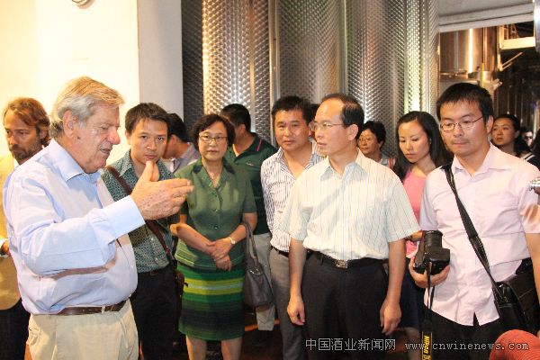 早上10点钟,来自罗马方向及佛罗伦萨方向的两辆旅游大巴来到了BOLGHERI的SASSICAIA酒园,酒园园主Nicolo' Incissa Della Rocchetta尼卡罗英吉沙侯爵和总经理Paoli鲍利先生以及多位酒园工作人员早已在大门外准备迎接。在进入酒园的花园小路上,Nicolo'园主对丁大使及周总领事表示:“像中国这样的大国驻意使节能够莅临本酒园,是我们莫大的荣幸!”丁伟大使表示:“贵酒园酿造的西施佳雅葡萄酒不仅是意大利最著名的精品佳酿,也是国际上赫赫有名的品牌葡萄酒。在许多外交场合上都能看到他的身影,希望你们的产品能够更好的拓展中国市场。”随后Nicolo园主引领访问团参观了酒园的酿造生产线和陈放橡木桶的酒窖。在其恒温酒窖里,访问团品鉴了酒园今年刚上市的新酒-2008年份的SASSICAIA,大家都赞不绝口。