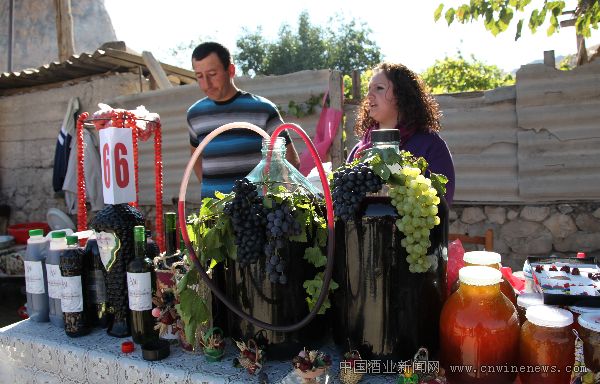 10月8日,在亚美尼亚瓦伊奥兹·济鲁区的阿列尼村举行的葡萄酒节上,村民正在销售自产的葡萄酒。
