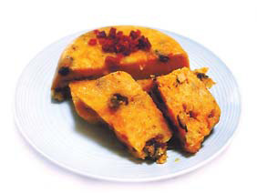 This is a very typical Fujianese snack. Pumpkins, or golden melon, are very much a staplevegetable along the coastal regions of south China and used widely in the cuisine. This goldenpumpkin cake is prepared during festivities, such as the Lunar New Year, the birth of agrandchild or the birthday of a venerable member of the family.